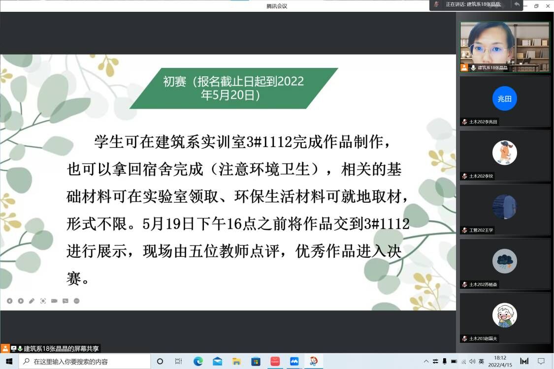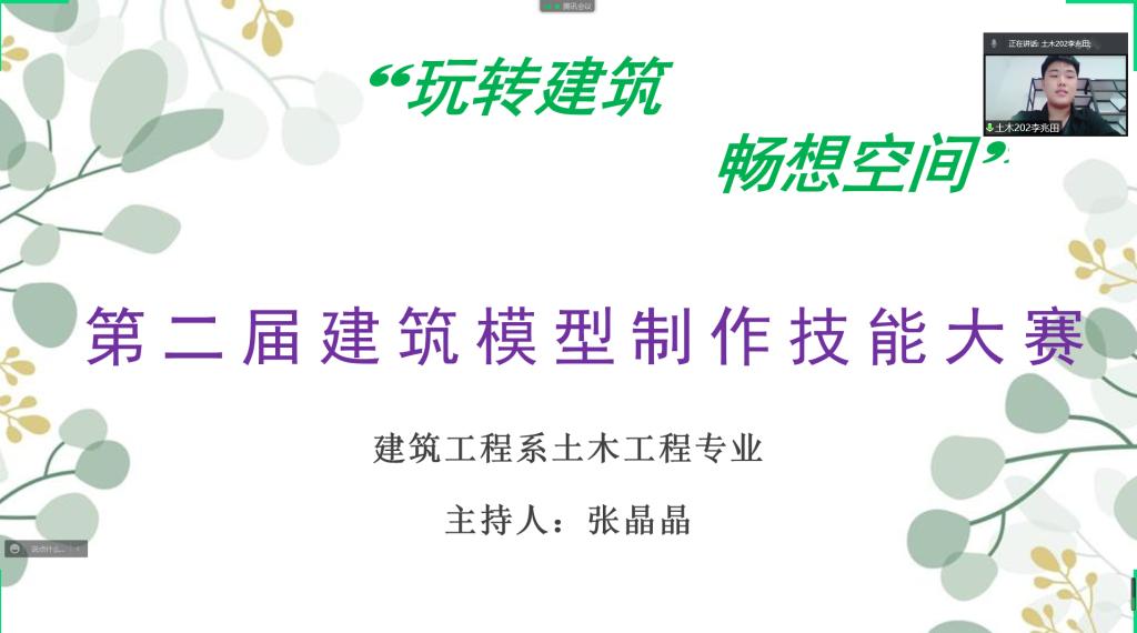 为贯彻本科院校人才培养计划,为学生搭建展示才能、成就自我的平台,培养广大学生的科学兴趣,提升全校学生的科学素养,让学生知校、爱校。建筑工程系土木工程专业举办此次“玩转建筑,畅想空间”建筑模型制作技能大赛,并于2022年4月15日晚6点通过腾讯会议召开本次大赛动员会。