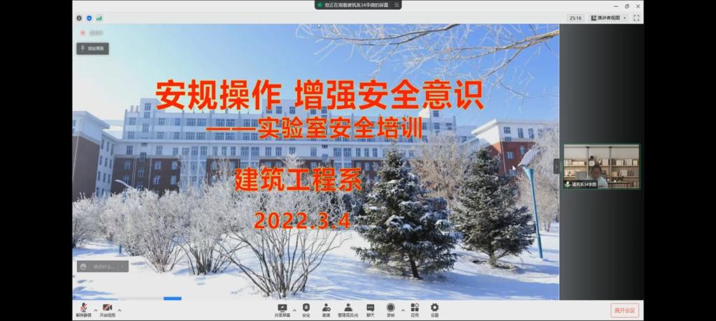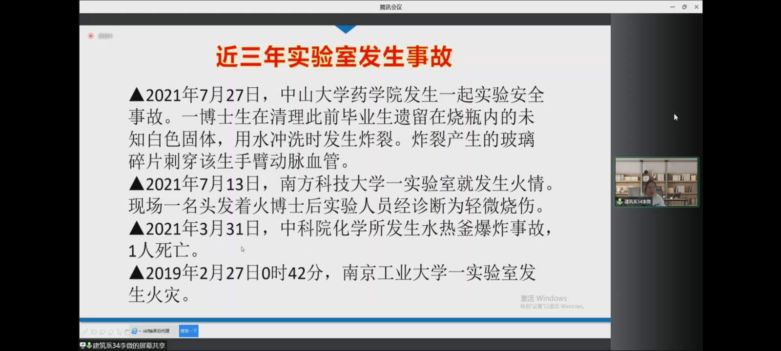 为进一步开展实验室安全教育工作,加强实验室安全管理,确保实验室成为安全的学习、科研场所,建筑工程系土木建筑工程实验中心于3月4日下午线上举行实验室安全专题培训会议,实验中心实验技术人员李盼盼、李微、国贺阳为培训人,建筑系全体学生参加此次培训。培训内容包括应急逃生、现场急救、消防实训、化学品伤害与应急救援等。