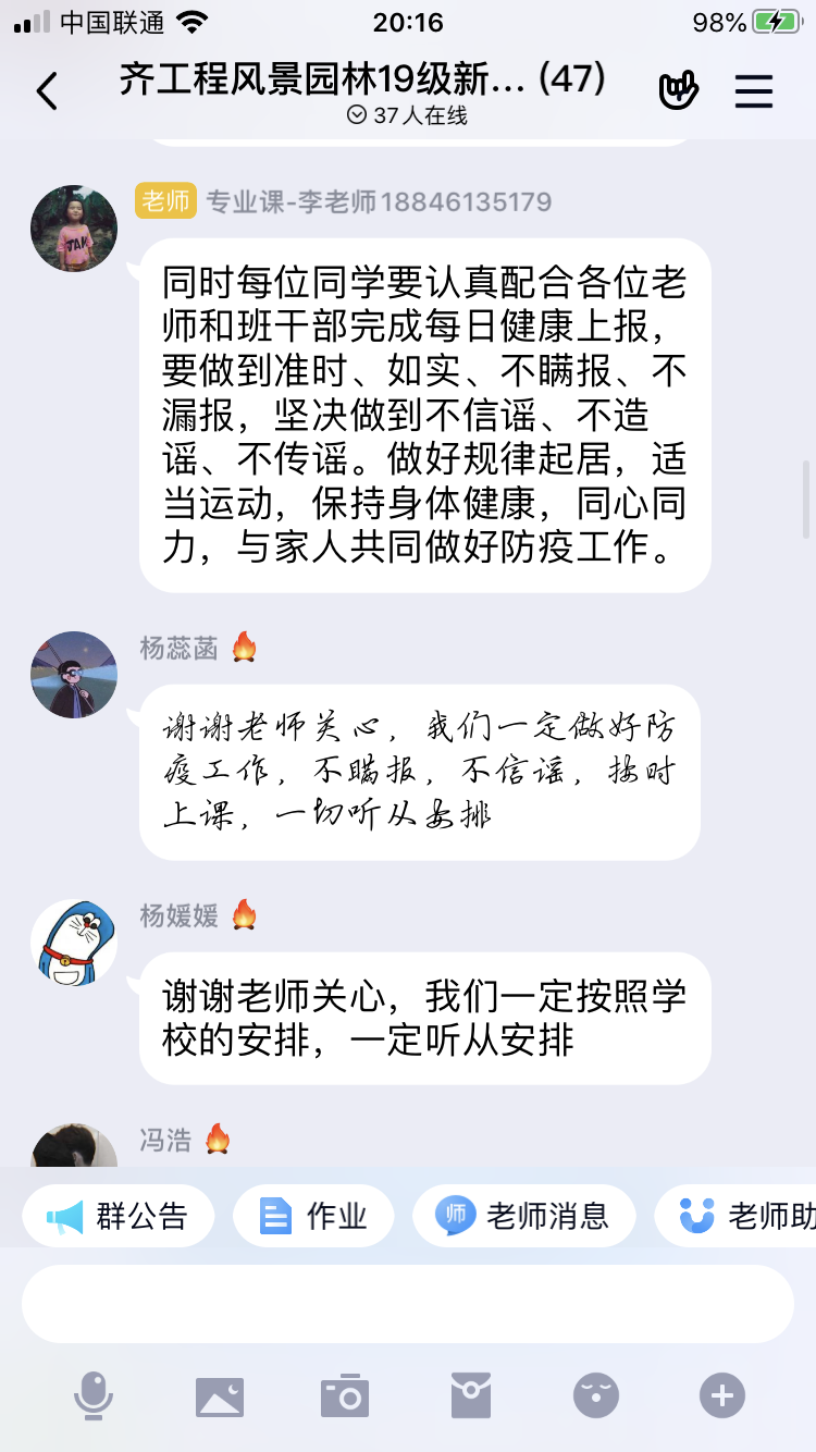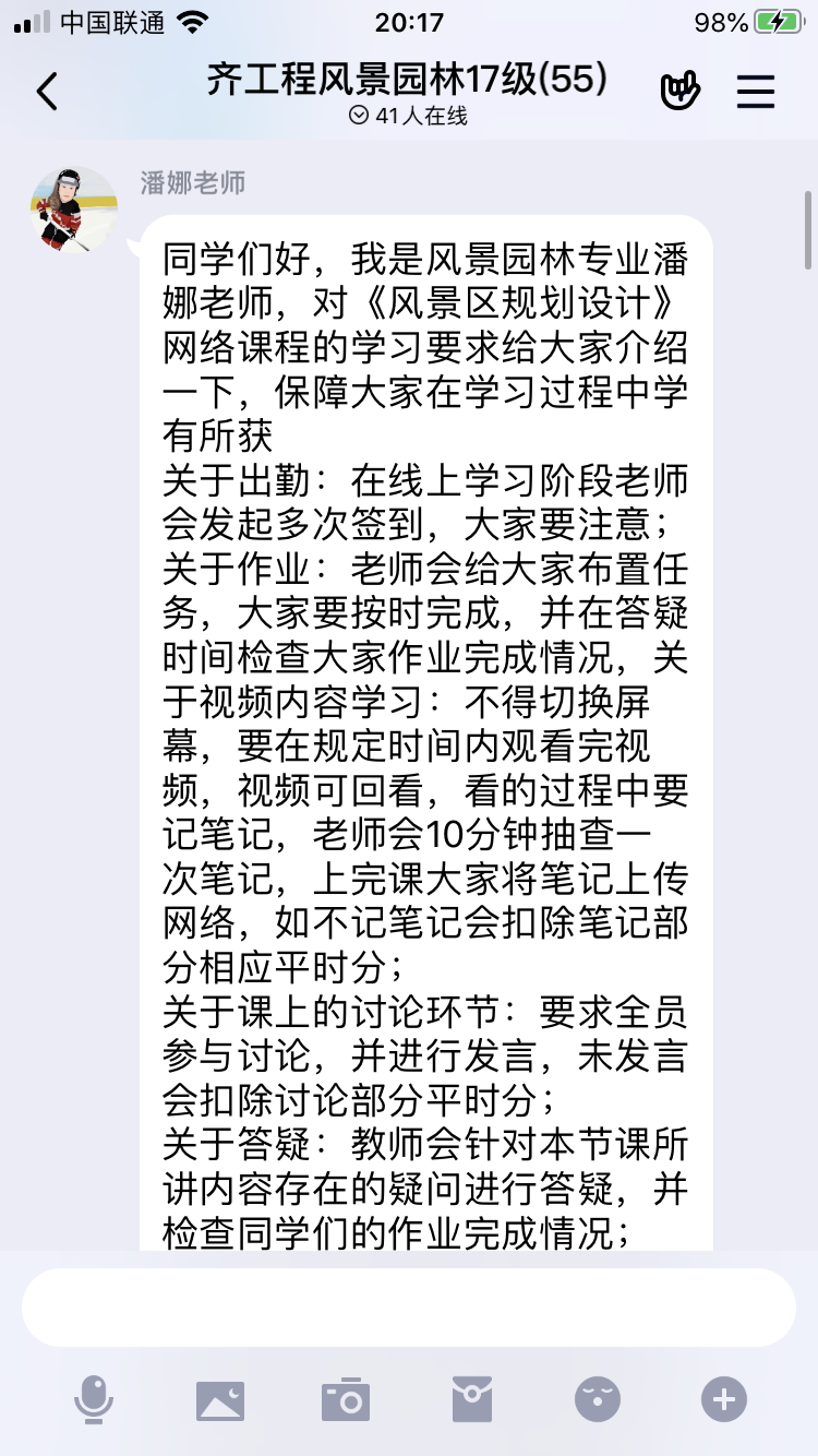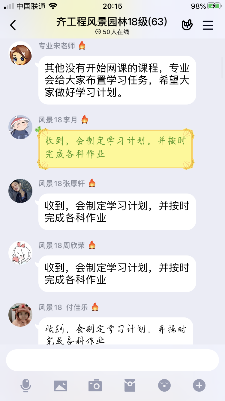 接下来,王鹏老师针对部分16级学生补考事宜作了说明,希望同学们抓紧复习,严格要求不放松。潘娜老师结合《风景区规划设计》课程,对17级学生在出勤、作业、视频学习、笔记等方面提出详细要求。高雅老师对18级学生《风景园林设计》课程线上教学提出要求,并解答了学生的疑问。李美靓老师对19级学生线上教学提出建议。
