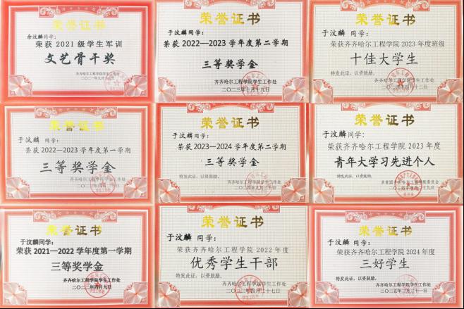 大学期间,她多次荣获学校的奖学金,2022—2025年,连续六个学期荣获三等奖学金。同时,“优秀学生”“班级十佳大学生”等荣誉称号也纷至沓来,但她并未因此而骄傲自满,而是将这些荣誉化作继续前行的动力,向着更高的知识山峰攀登。