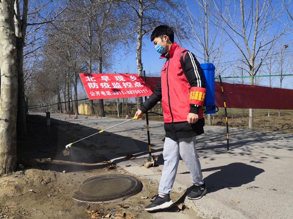 土木183班共青团员王浩茗在河北省石家庄市正定县北早现乡安谷村做疫情防控志愿者,主要是管理居民进出登记工作和消毒工作。