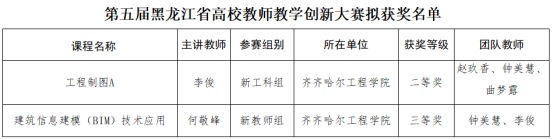 4月29日,由黑龙江省教育厅主办的第五届全国高校教师教学创新大赛(黑龙江赛区)在东北林业大学落下帷幕。建筑管理工程系李俊老师《工程制图A》课程团队获得新工科副高组二等奖、何敬峰老师《建筑信息建模(BIM)技术应用》课程团队获得新教师组三等奖。