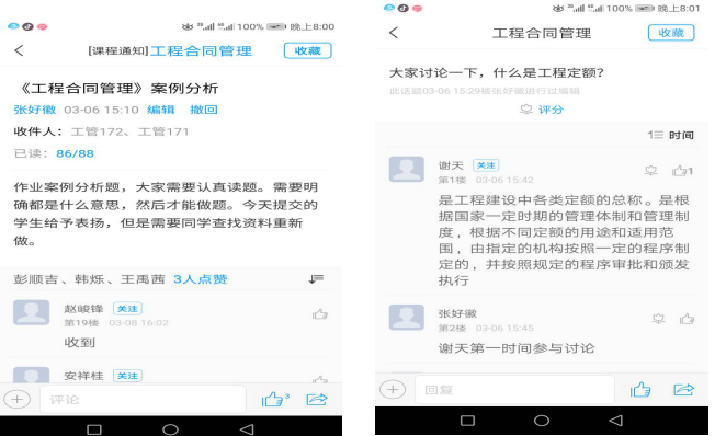 3.实现师生之间动态联系,融入课程思政元素。张老师转换“由教师的教和学生的学的静态联系”成为“在老师和学生之间相互学习的动态联系”。每讲到案例知识点时,学生就会通过学习通自动留言与教师进行互动。她看见学生的留言,会对相应的问题进行解答或者交流,“见机”就会融入课程思政元素,如张老师讲到“火神山”医院的建设奇迹等相关内容,传递给同学们爱国、奉献等精神,引起大家的共鸣。