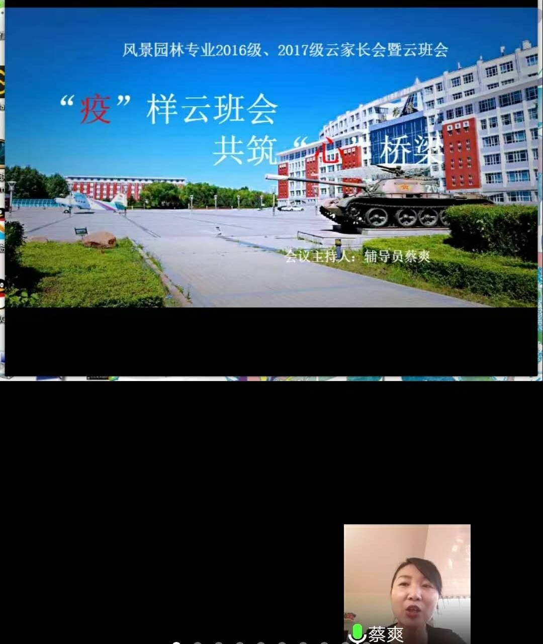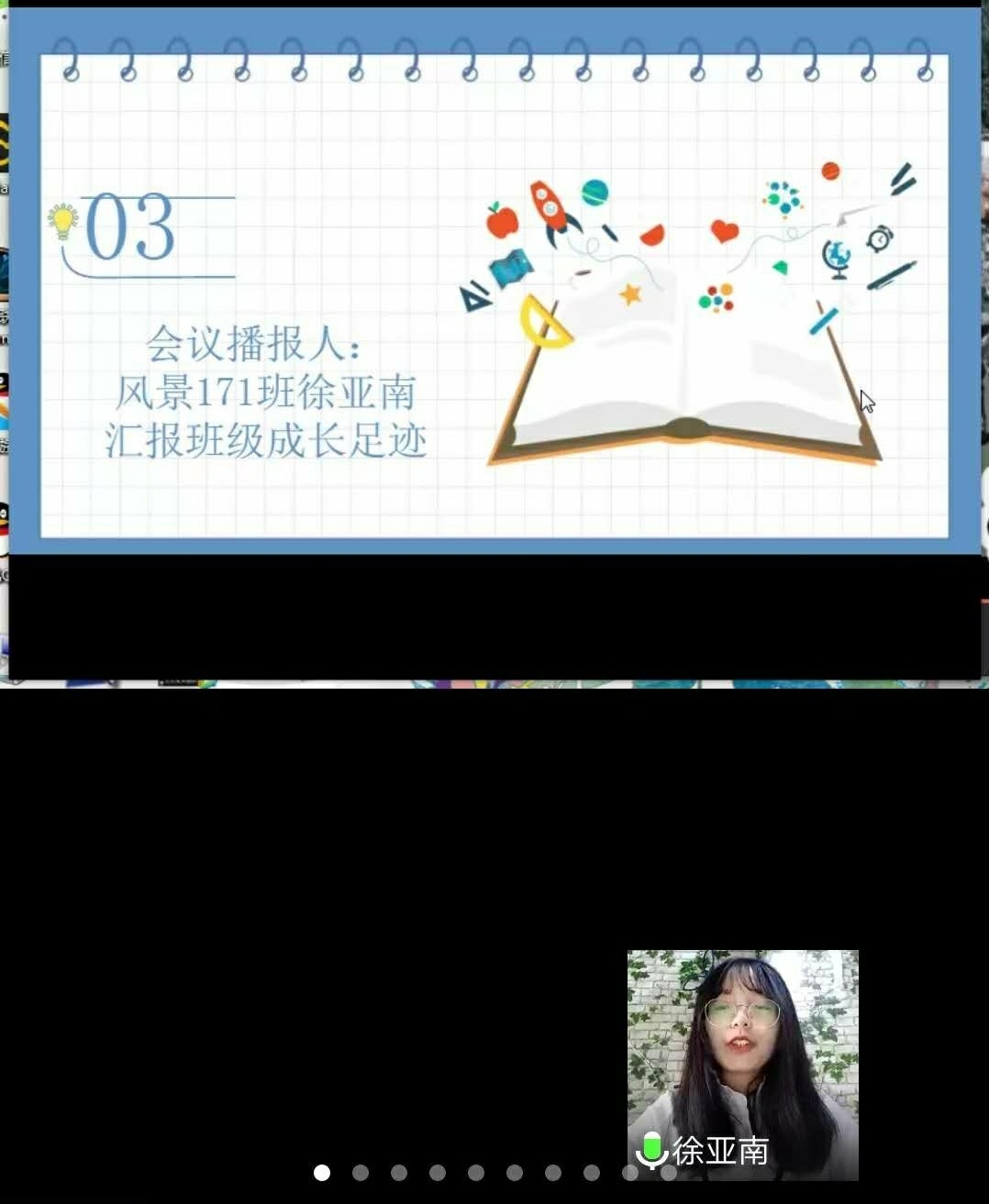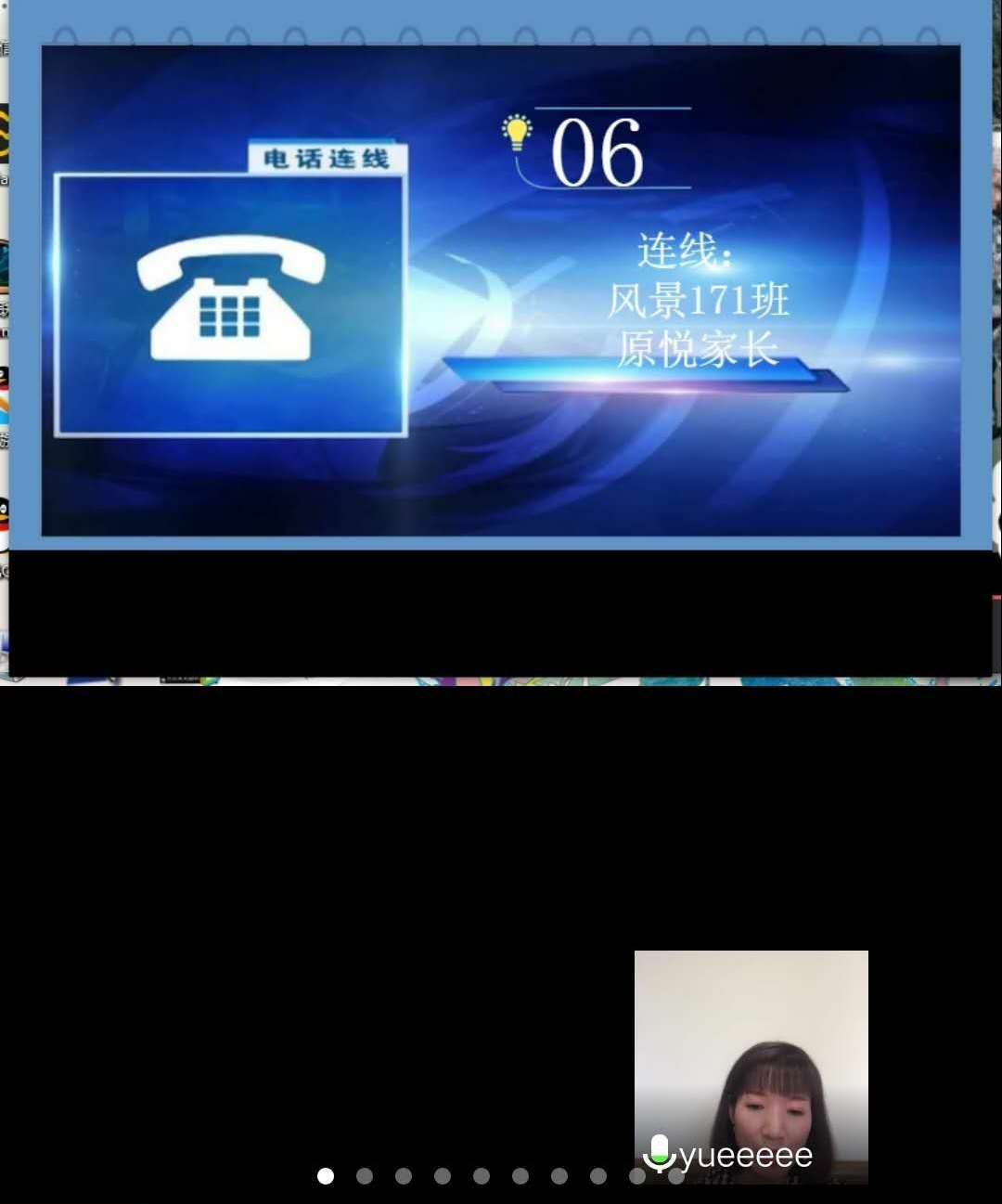 蔡爽老师向学生及家长介绍了学校办学理念及相关管理制度,邀请家长们观看了学生自入学以来的成长视频,强调了在线学习的重要性和要求。并由风景161班张文卓及风景171班徐亚南、闫晨三名会议播报人分别向大家汇报了风景161班大学四年,171班学生大三第一学期的成长足迹及疫情期间班级涌现的先进典型。蔡老师还连线风景171班原悦同学及其家长,了解该同学居家勤奋学习的表现及家长配合学校在线教学的情况。