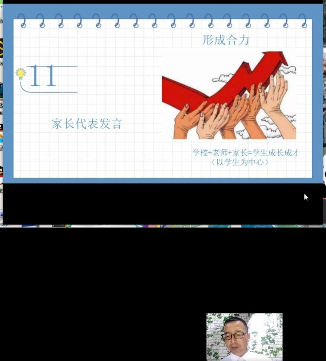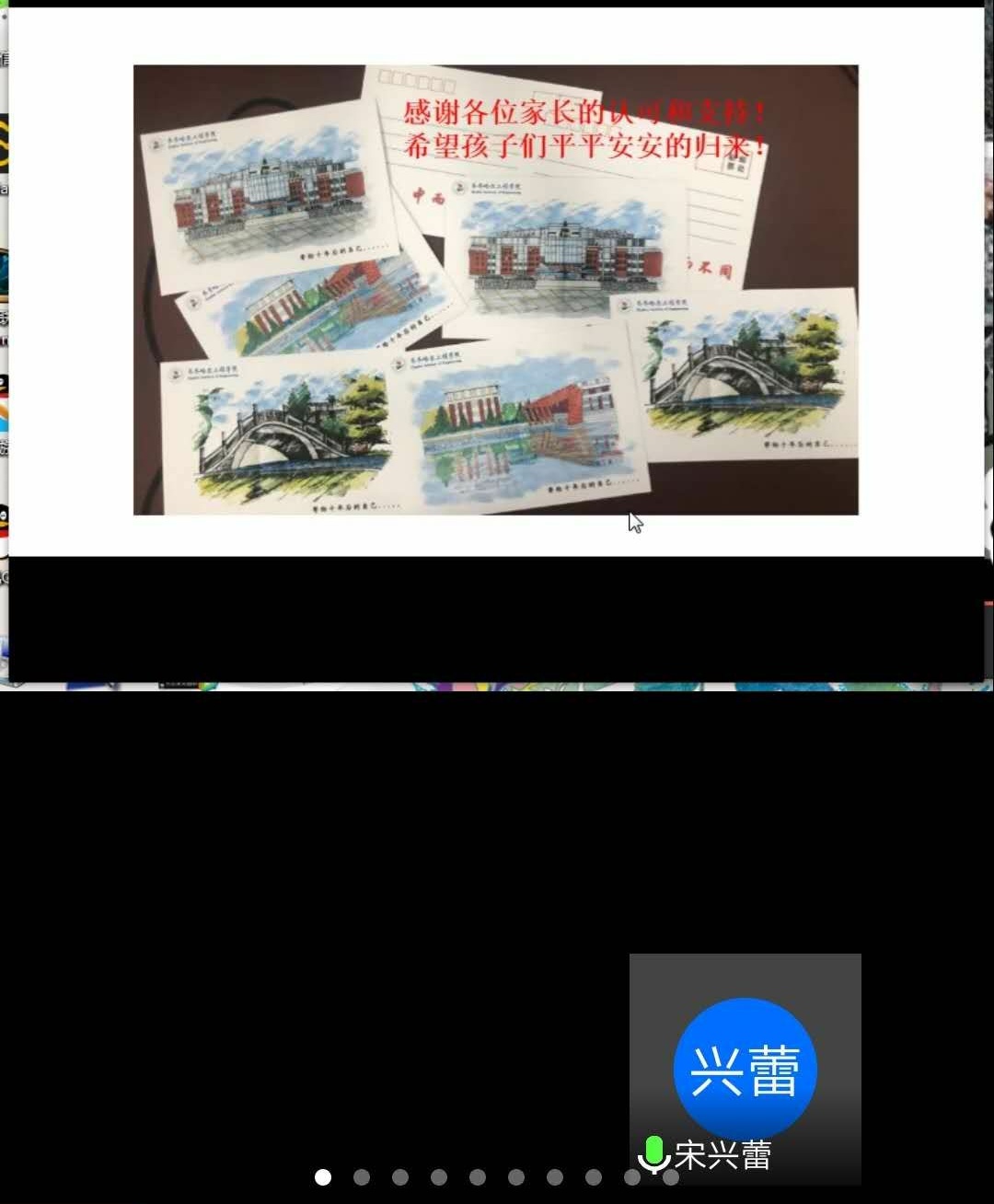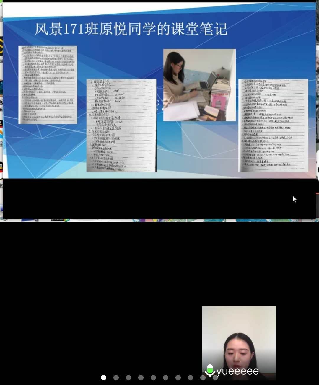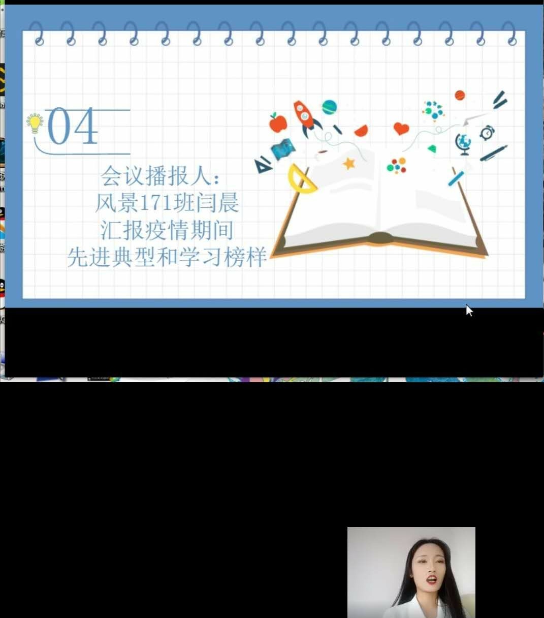 蔡爽老师向学生及家长介绍了学校办学理念及相关管理制度,邀请家长们观看了学生自入学以来的成长视频,强调了在线学习的重要性和要求。并由风景161班张文卓及风景171班徐亚南、闫晨三名会议播报人分别向大家汇报了风景161班大学四年,171班学生大三第一学期的成长足迹及疫情期间班级涌现的先进典型。蔡老师还连线风景171班原悦同学及其家长,了解该同学居家勤奋学习的表现及家长配合学校在线教学的情况。