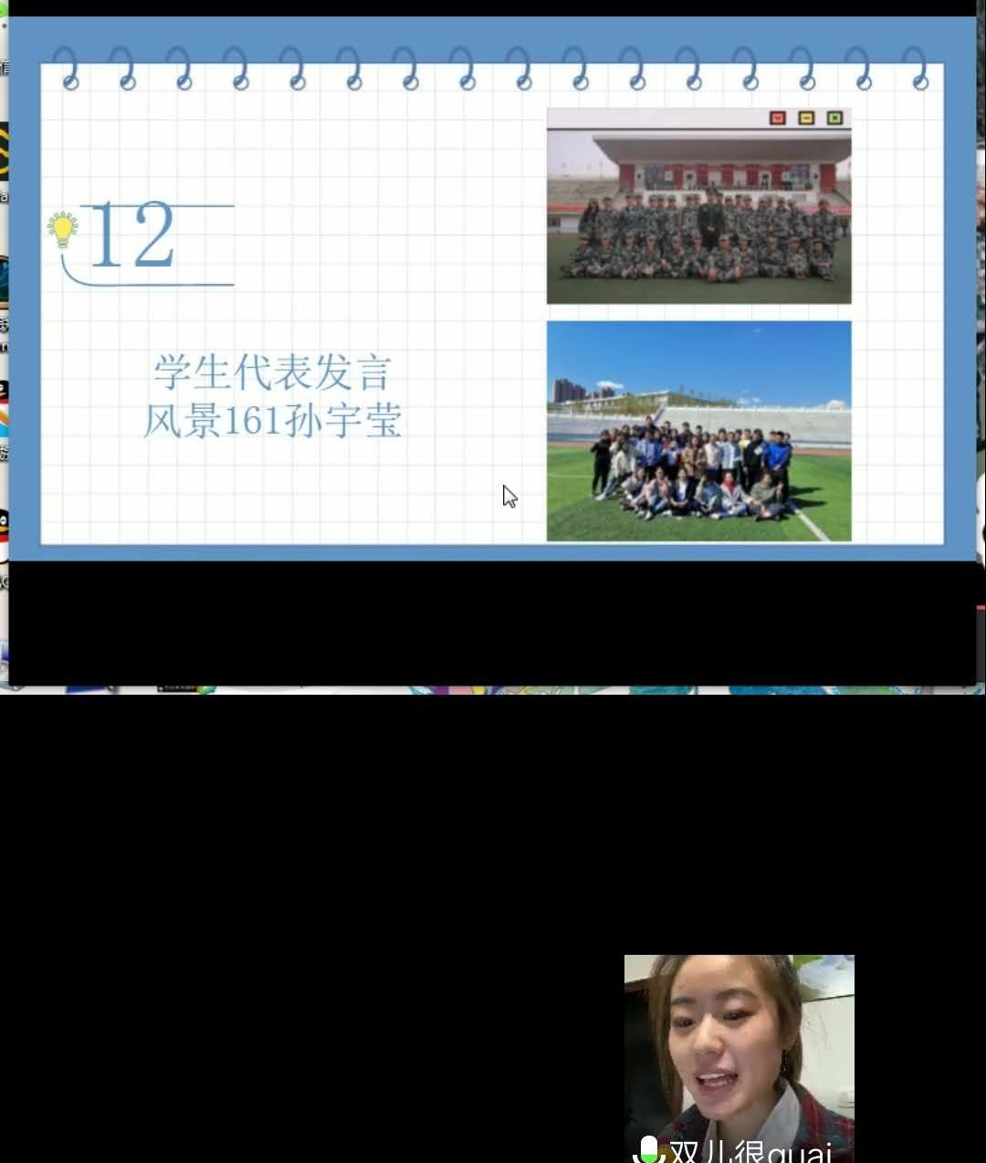 蔡爽老师会上现场连线我校风景园林18级毕业生迟博文同学为有考研学习深造的学生介绍了相关经验和建议。为即将毕业的学生连线齐翔建工集团徐喜辉工程师为学生介绍了用人单位的人才要求及招聘标准,并给出求职建议。连线部分家长及学生代表:风景171班徐亚南的家长发言中对学校办学理念十分认可,并对学校和老师的辛勤付出表示感谢,表示对于孩子的居家学习给予大力支持和积极配合。风景161班班长孙宇莹同学表示,十分感谢各位老师的培养与关心,并建议学弟学妹们珍惜大学生活,努力学习争一流。