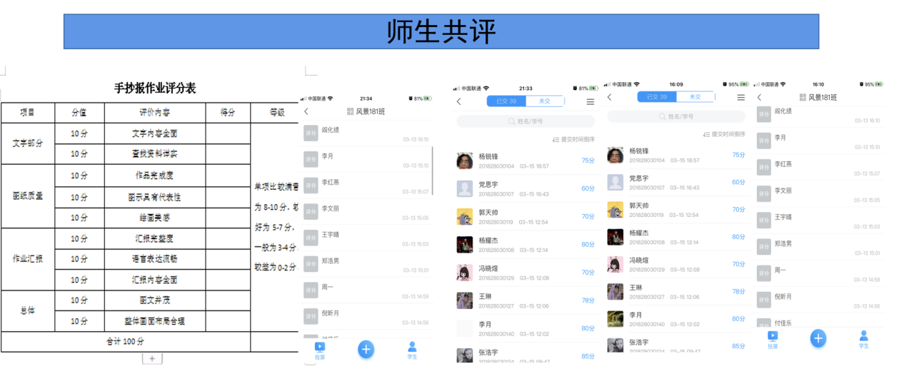 对于学生的作品评价,采用教师评分和学生互评两部分组成,学生互评采用汇报同时进行学习通打分取平均分的方式,教师打分通过作业上传进行打分,各占总分的50%。教师会提前下发评分标准,根据标准进行打分,通过这样的方式进一步让学生清楚任务完成的标准和知识需要掌握的程度。
