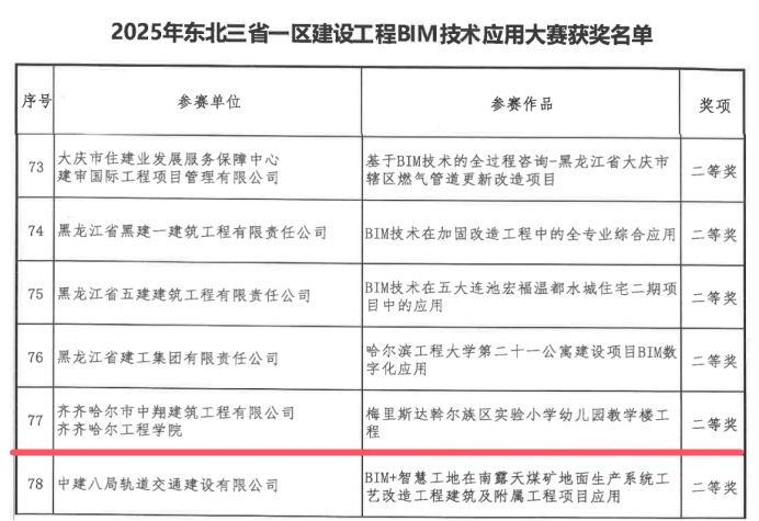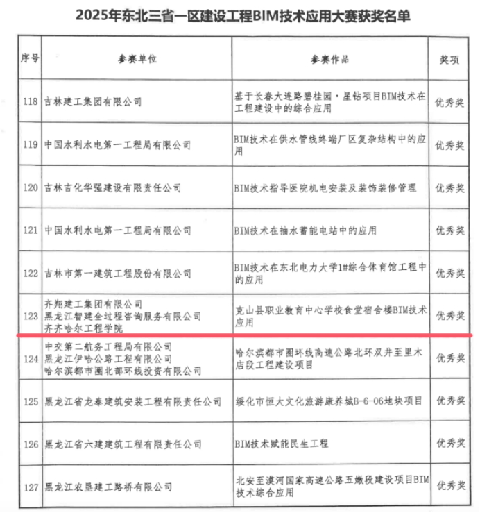 近日,东北三省一区2025年度建设工程BIM技术应用大赛结果揭晓,齐齐哈尔工程学院土木工程专业依托产业学院协同育人平台,联合产业学院合作企业打造优质项目,在众多成果中脱颖而出,斩获二等奖与优秀奖各一项,尽显专业BIM技术教学实践功底,彰显校企协同育人成效。