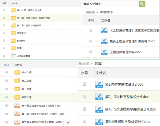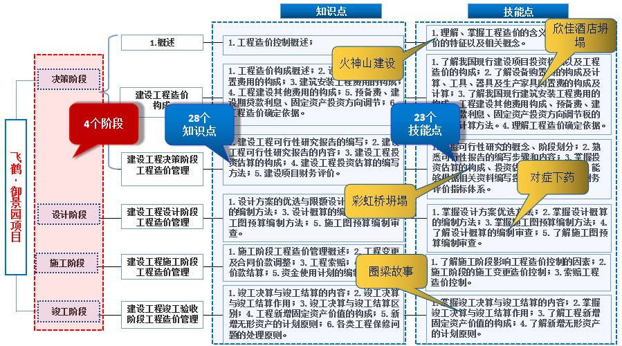 主要以飞鹤·御景园项目为例参与到本门课程,具体工作过程分为4步,分别为决策阶段、设计阶段、施工阶段、竣工阶段。其中采用团队合作教学组织方式,包含知识点28个,技能点23个,对应学生在实际工作中的造价、施工、资料、项目管理师类岗位,为考取造价工程师、咨询工程师、建造师等职业资格证书奠定基础。