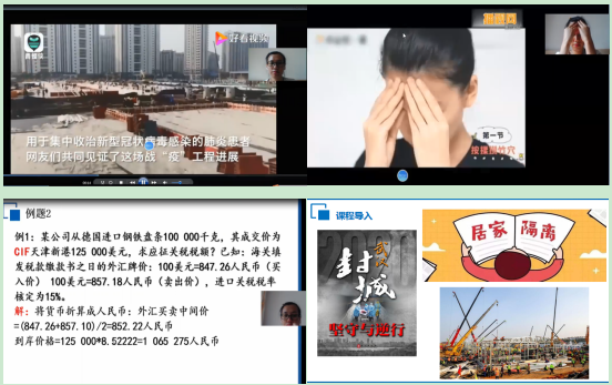 对我而言,线上教学是第一次,有很多地方需要摸索和尝试。通过几周的教学实践,我发现师生交流有限,无法把握全班学生的听课状态,不能实现小组交流,只能安排课下小组自行讨论,但不可否认,线上教学是线上教学的有力补充,我相信在未来我会更好得利用线上教学方法,扬长避短,让线上和线下相辅相成。疫情,造就了一堂堂特殊的线上课程,在课程中注重形式创新,积极推动线上教学实践,在线上课堂中继续传递坚定信心、讲述中国故事、迸发积极的正能量。