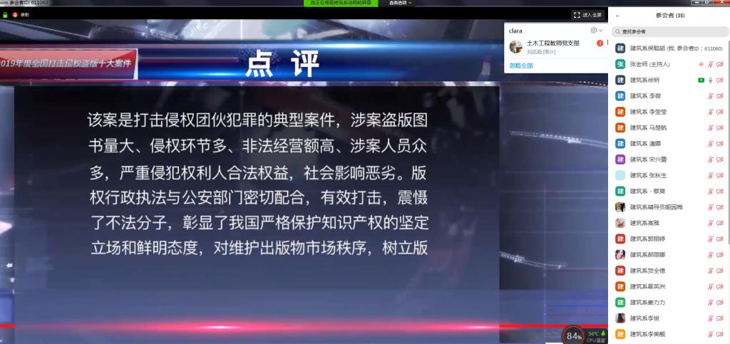 全国知识产权宣传周活动刚刚过去,4月28日晚,建筑工程系通过zoom会议平台组织教职工学习版权相关知识,加强版权宣传普及。会议由张好徽老师主持。