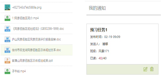 以学生为中心,参照脑科学、布鲁姆法则进行了课程设计,布置《风景区规划设计》课程目录。提前布置预习任务,在学习通布置电子教材、趣味视频、多个真实风景区项目设计方案、案例任务点,任务前置,引导学生自学。