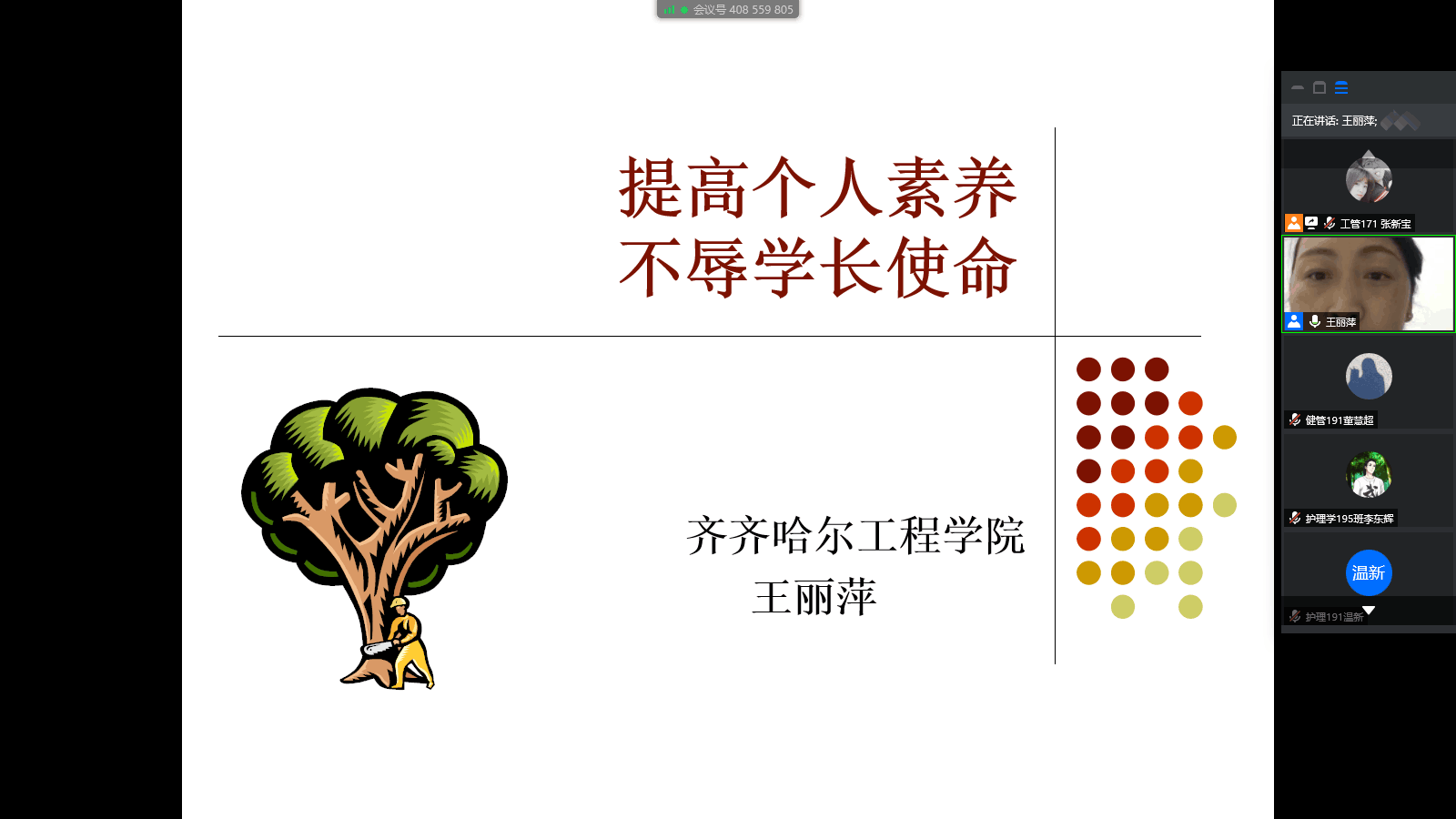 作为一名学长,是一种荣耀、是一种责任、更是一种担当,5月25日,建筑工程系和健康与护理系王丽萍书记通过腾讯会议的形式,为建筑工程系和健康护理系2020级拟选学长进行名为《提高个人修养,不辱学长使命》第一期学长培训,建筑工程系2020级拟选学长全员参加。