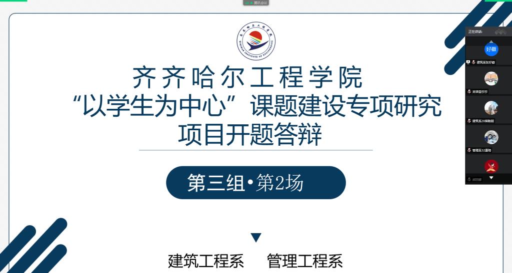 6月11日组织了第二场共有7组进行专项答辩,汇报的项目分别是管理系康琦老师的《应用型本科大学英语课程思政研究与实践》、雷莎莎老师的《学生线上合作学习能力在应用型本科院校大学英语教学中的培养策略研究——以“大学进阶英语综合教程”》为例、钟美慧老师的《线上教学与后续线下教学有效衔接研究——以“工程制图(含CAD)B II”为例》、赵玖香老师的《基于以学生为中心的“课程思政”教学设计模式——以“工程制图C”为例》、郝丽娜老师的“土木工程材料”线上线下混合式教学模式研究》、侯聪超老师的《基于疫情线上课程的“以学生为中心”教学改革与实践》、张晶晶老师的《基于以学生为中心的“工程造价管理”课程教学设计模式研究》,汇报人根据项目实施方案制作PPT,分别从项目研究目标、研究内容和创新点,研究方法、研究过程及预期研究成果等进行了汇报。专家在事先审阅项目实施方案基础上,结合项目组汇报情况,进行现场提问,并从选题、具体研究内容、研究目标、创新等方面给出了有针对性的意见或建议。