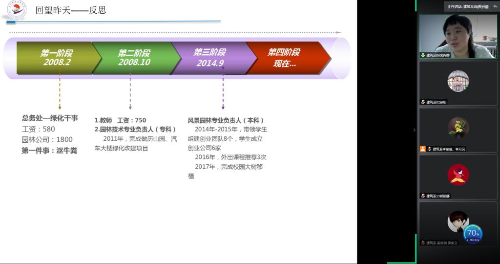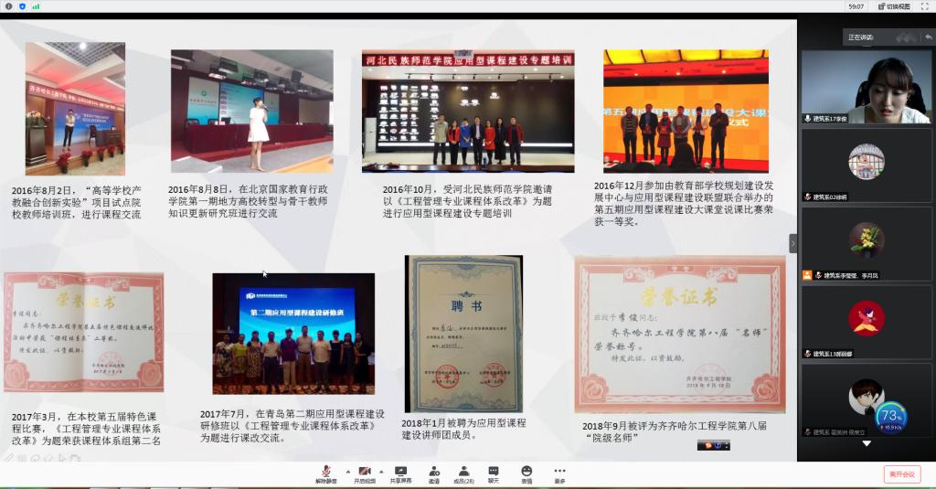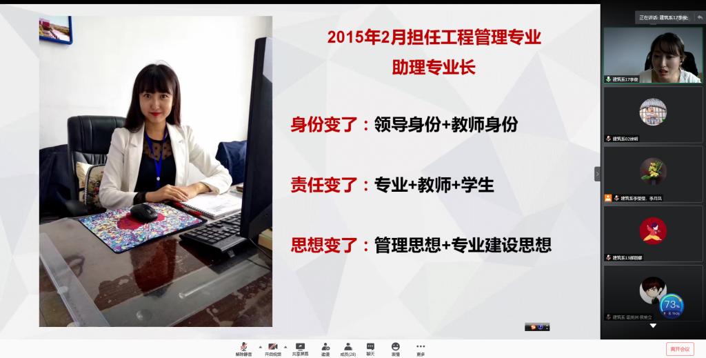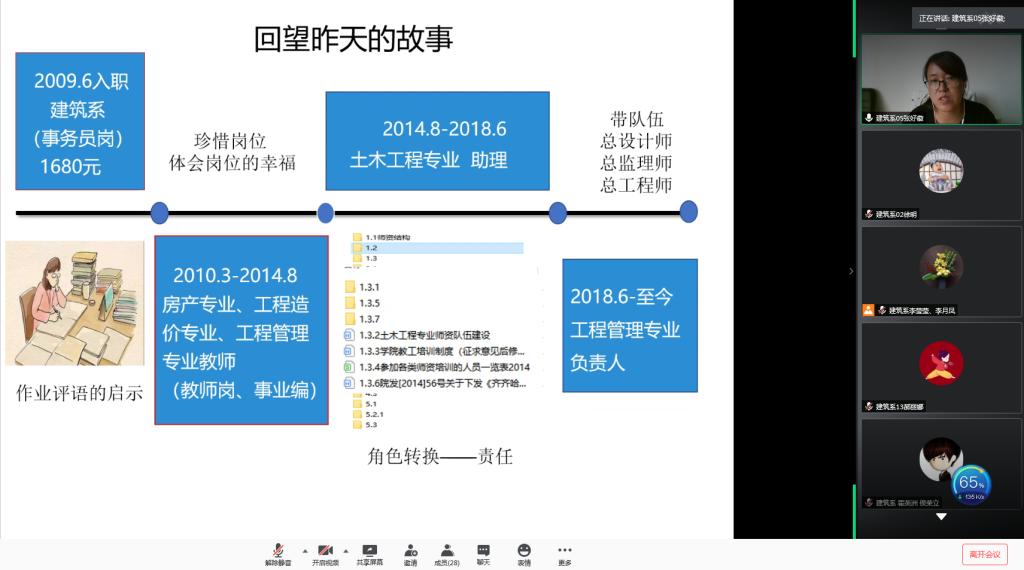 6月17日下午,建筑工程系在线组织成长故事分享会,会议由教学副主任徐明主持,全体教职工参加活动。会上专业长张好徽、李智慧、宋兴蕾,教师李俊、姜力力、潘娜分享个人成长故事。
