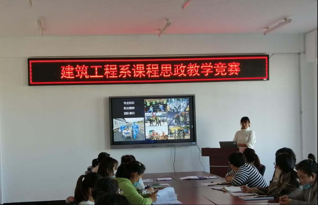 10月27日下午,建筑工程系在2教2409会议室组织开展《建筑工程系课程思政教学竞赛》,竞赛由李莹莹主持,赵玖香、贺全德、李俊、张晶晶、侯聪超、王鹏、姜力力7名教师参加,全体教工参加并担任评委。
