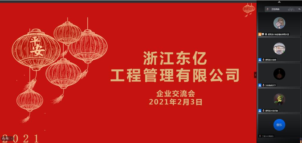 建筑工程系以“提高就业质量、加强校企融合”为目标,力争扎实落实校企合作,为毕业生就业工作做好前期准备和动员,为毕业生明确就业方向,加深行业认知,于2021年2月3日上午组织召开就业工作交流会。交流会邀请了浙江东亿工程管理有限公司总监理代表李岩及其团队,为我校在校生做企业交流。交流会由建筑工程系教师曲梦露主持,建筑工程系教学副主任徐明主任、土木工程专业负责人钟美慧、工程管理专业负责人张好徽和专业教师李俊、风景园林专业负责人宋兴蕾等教师参会,我校2021届100余名学生参加。