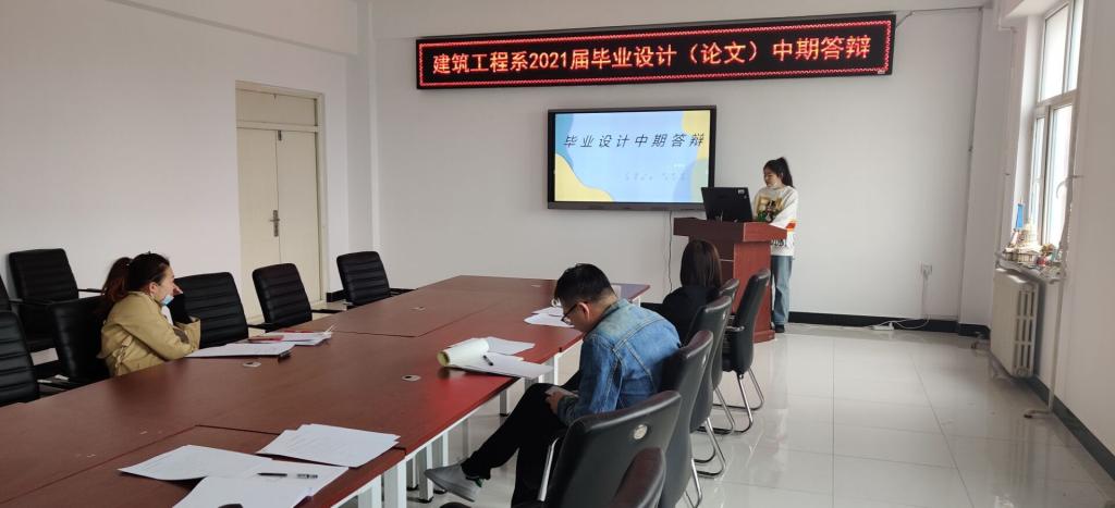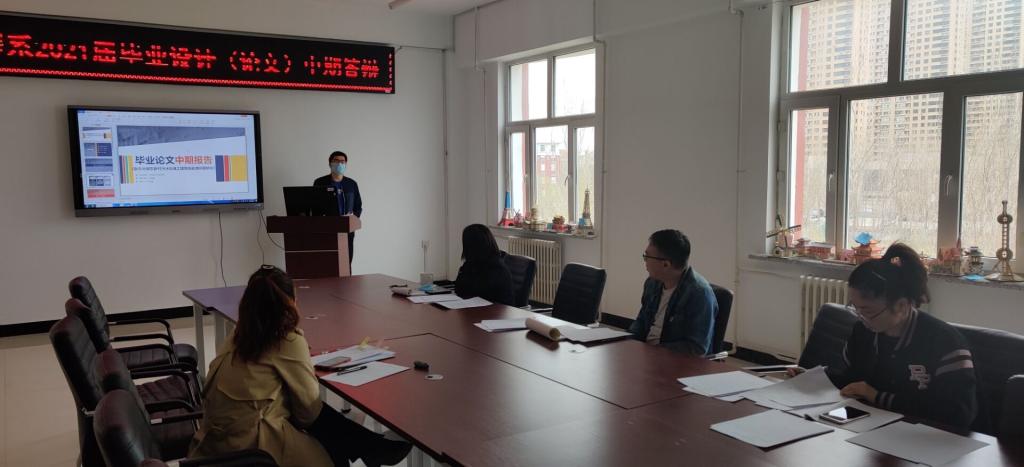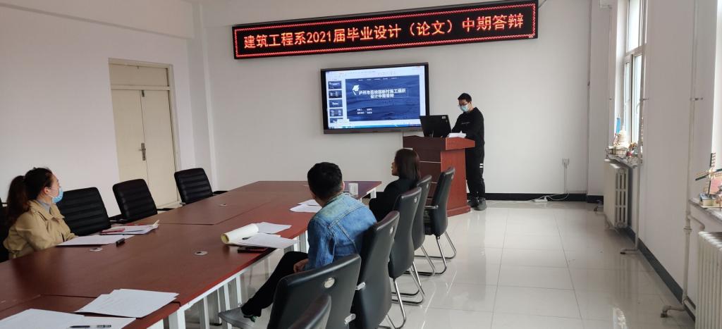 为进一步掌握2021届本科生毕业设计进展情况,确保毕业设计质量,根据建筑工程系统一部署安排,4月24日前各专业要完成毕业设计中期答辩抽查工作。于4月28日建筑工程系开展毕业设计中期检查答辩,建筑工程系教学副主任徐明任答辩检查组组长,专业负责人曲梦露、宋兴蕾、各教研室指导教师等多名教师组成的评委参加检查答辩工作。