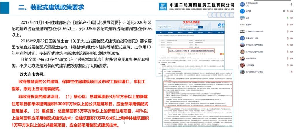 为切实提高建筑工程系教师装配式建筑相关的专业知识、实践水平,2023年12月26日,建筑工程系组织教师及实验技术人员参加中建二局第四建筑工程有限公司组织的装配式建筑内部培训,培训采用腾讯会议方式进行,培训介绍了装配式建筑概述、现场施工前准备、施工工艺及关键节点、质量重点管控措施、安全重点管控措施等内容。
