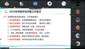 会议第一阶段为审核评估推进会,主任助理王梓玮结合《普通高校本科教育教学审核评估(2021-2025年)工作指南》,带领建筑系全体人员深入学习理解审核评估指标的内涵和重点内容;同时布置了2024年审核评估评建工作的重点,包括修改、完善自评报告初稿的内容和完成的时间节点;制定新学期任务清单,并完善建设重点任务工作方案;加强教育教学基本建设工作、完善审核评估材料准备工作;组织迎评工作等。