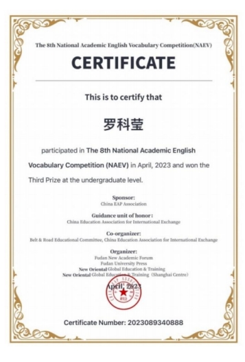 她始终坚信“学贵有恒,学须崇实”。入学以来,她认真学习专业知识,投身专业实践。她有着清晰的学习计划,并能合理、周密地安排时间。上课认真听讲,积极互动,课后认真完成学业任务,遇到不会的问题能虚心求教。通过自身的努力,通过国家英语四级考试、荣获岗位证书、第八届全国学术英语词汇大赛三等奖等荣誉。