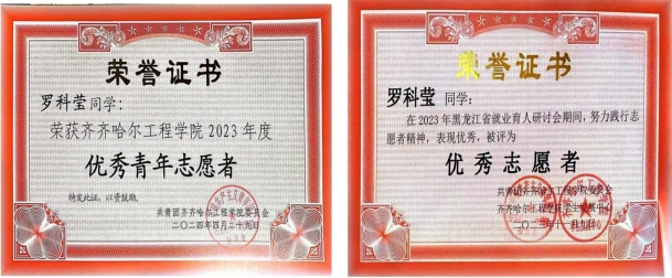 2024年4月 齐齐哈尔工程学院 2023年度优秀青年志愿者;
