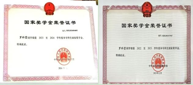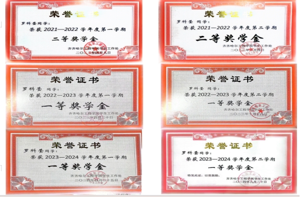 “立身以立学为先”。罗科莹在大学生活中保持勤奋刻苦的学习态度和持之以恒的学习韧劲,认真学习科学文化知识,不断拓宽知识领域、完善知识结构。凭借着这份坚持与努力,她的平均学分绩点保持在3.5以上,荣获连续两年国家奖学金、校一等奖学金、校二等奖学金,“黑龙江省三好学生”“国家励志奖学金”。