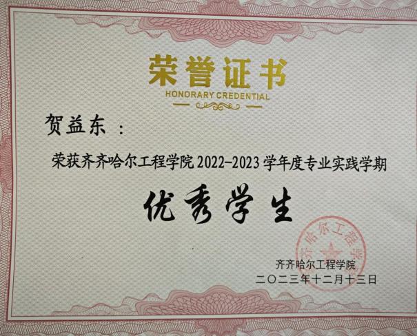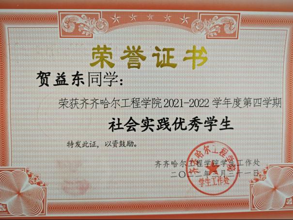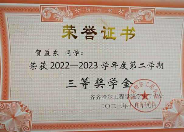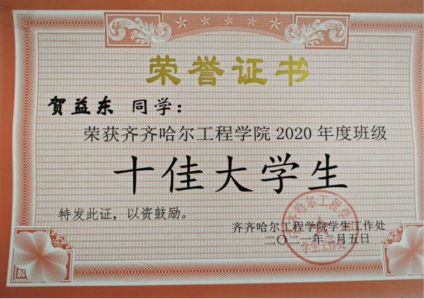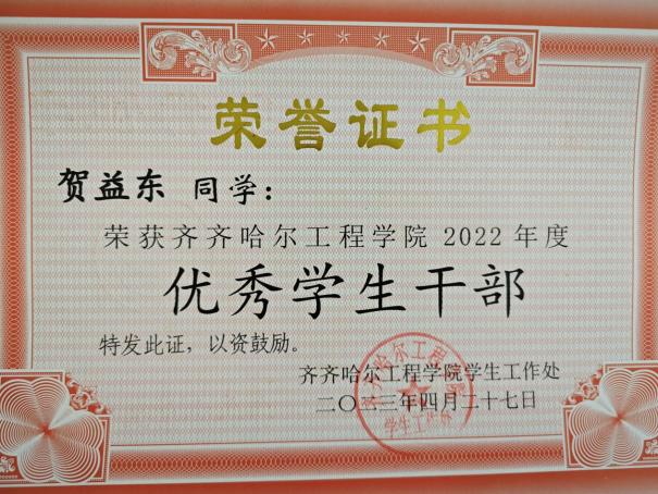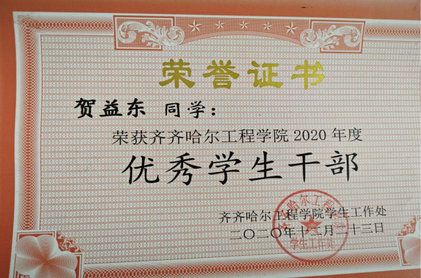 贺益东,男,汉族,中共预备党员,出生于2000年1月,现就读于齐齐哈尔工程学院建筑工程系工程管理专业,工管202班班长。建筑工程系工管212班学生辅导员,曾获得5次校级奖学金,多次获得优秀学生干部,十佳大学生,社会实践优秀学生,专业实践优秀学生干部等荣誉。2024年5月通过研究生考研复试,被内蒙古工业大学物流工程与管理专业录取。
