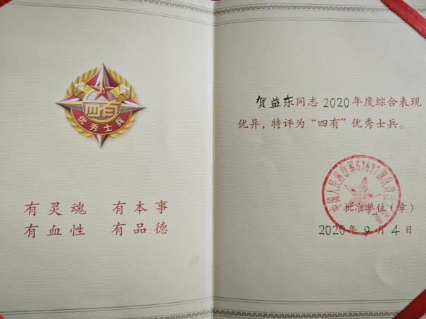 贺益东以“道阻且长,行则将至”为座右铭。在从军入伍期间服役于中国人民解放军战略支援部队,在入伍期间从事阵地救护任务,奋斗在一线,参加40余发小型固体火箭,大型固体火箭和长征系列运载火箭发射任务,获得“四有优秀士兵”等荣誉称号。