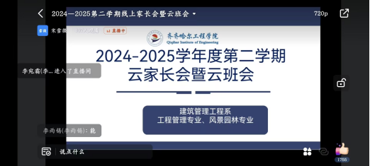 为进一步加强家校沟通,促进学生全面发展,2月27日下午,建筑管理工程系辅导员宋雪微线上召开智能建造专业2024-2025学年度第二学期云家长会暨云班会,专业长张晶晶老师出席并发言,全体生涯导师、学生及家长参加。