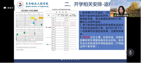 此外,会议还对学生选课、补考和返校安全、返校要求等方面进行了强调。宋雪微老师提醒同学们要时刻注意人身安全、财产安全和网络安全,合理安排学习和生活时间,保持积极乐观的心态,积极准备开学补考和社会实践学习各项材料。