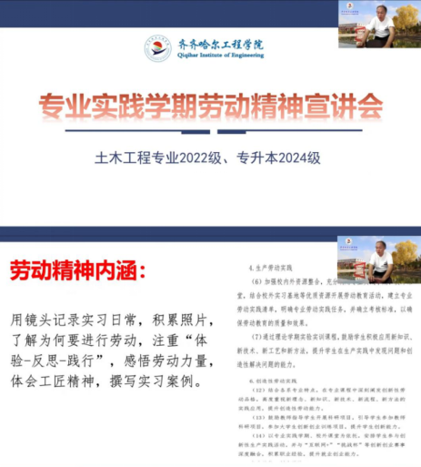 为深入贯彻落实学校关于劳动教育的重要部署,进一步推动劳动教育在学生群体中的广泛开展,辅导员刘子豪于7月16日中午以钉钉直播的方式组织召开了以“践行劳动精神,绽放青春光彩”为主题的劳动精神宣讲会,全体土木22及专升本24级同学参加此次会议。