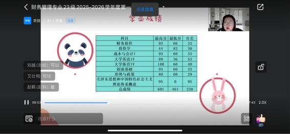 会议中,李娆以数据为依托,通过图表形式呈现上一学期学生整体成绩水平、分差区间以及各科成绩分布情况,让学生和家长直观了解学业整体态势。李娆聚焦学业复盘与短板突破,深入分析问题成因,如基础知识点掌握不牢固、学习方法不当等。同时,对挂科学生进行精准提醒,明确补考时间节点、复习重点范围,并建议其结合线上复习资源与学习笔记强化薄弱环节;邀请成绩优异的学生在线分享高效学习方法,包括时间管理技巧、课堂笔记整理方式、课后习题巩固策略等,倡导形成“以优带弱、互助共进”的班级学习氛围,帮助学生找准学习短板,制定个性化新学期学业提升计划。