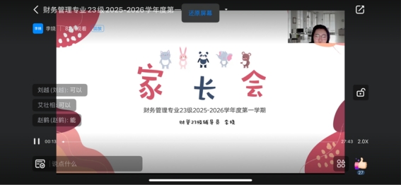 新学期到来之际,为精准沟通学生学习生活状态,搭建高效家校联动桥梁,助力学生快速调整身心状态、明确新学期学业方向,土木与管理学院财务管理专业23级辅导员李娆于8月30日线上召开2025-2026学年度第一学期期初云班会暨云家长会,财管23级全体同学及家长参加。