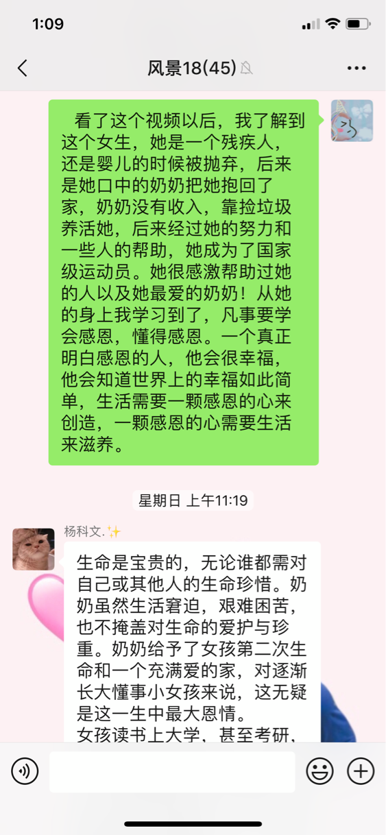 通过网络,大家观看了山西大学硕士研究生“独臂天使”高思恩的事迹,同学们被深深感动着,对高思恩顽强的意志和感恩的心感染了,并且表示向高思恩学习,怀着一颗感恩的心,奋斗在美好的新时代,为祖国的繁荣富强贡献力量。