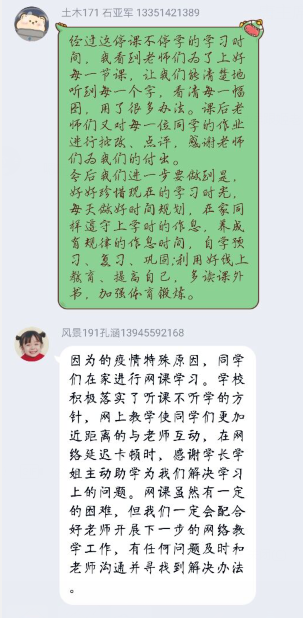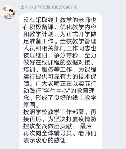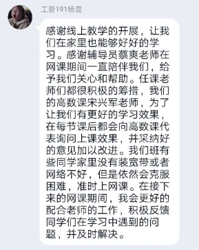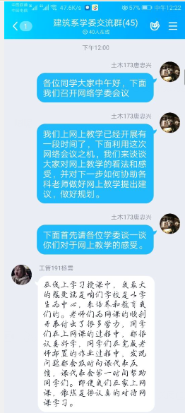 会上,各班学委畅所欲言。有同学认为,线上教学有利于整合优秀的网络资源,提高了教学质量;有同学认为,线上教学不受时空限制,教学更灵活快捷;有同学表示,任课老师和辅导员无微不至关心大家,尽心尽力为同学们解决困难,助学的学长们课后答疑解惑等等,成为居家抗疫的难忘经历。