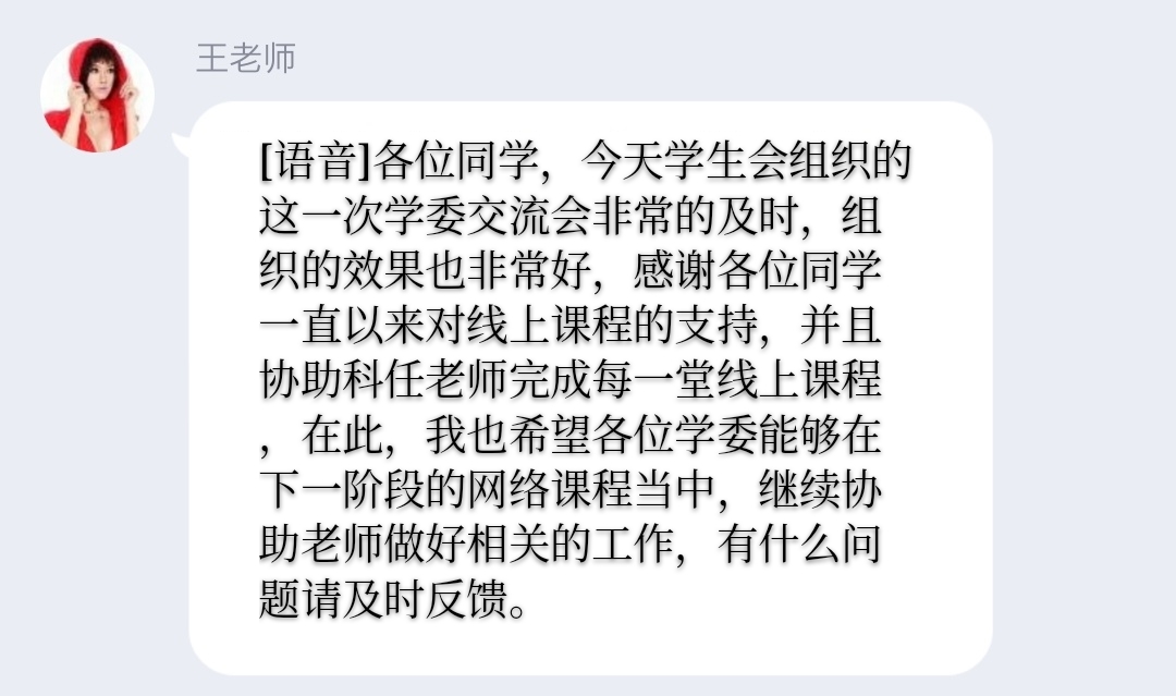 最后,王丽萍书记希望各位学委继续积极配合老师的教学工作,有问题向专业长或系里及时反馈,一起做好线上教学工作。