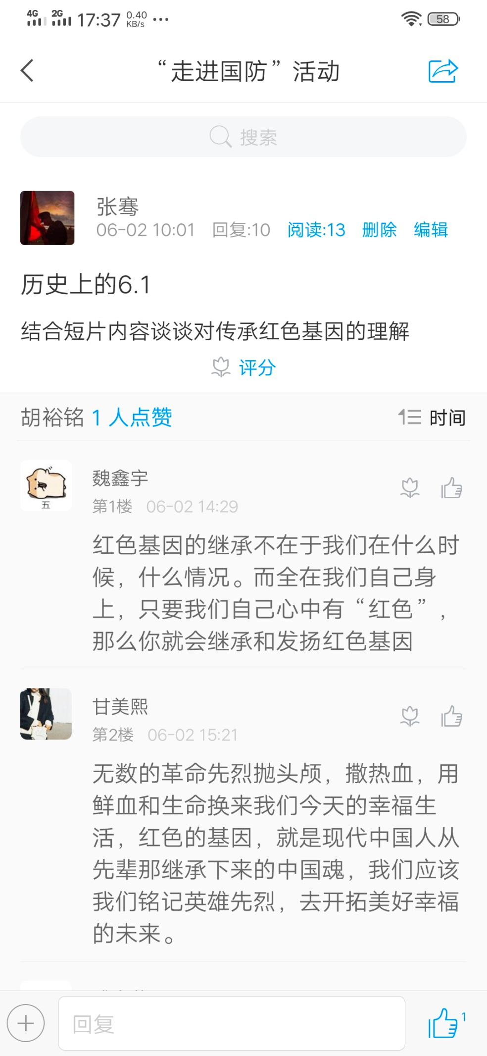 建筑工程系军魂社团于2020年6月2日举办“历史上的6.1”活动,活动内容通过观看中国人民抗日红军大学纪录片,来使同学们加强对史实的了解,同学们的学习态度很认真,认真观看纪录片,积极在讨论区做出自己的感悟分享,分享的体会心得也都有自己的见解。