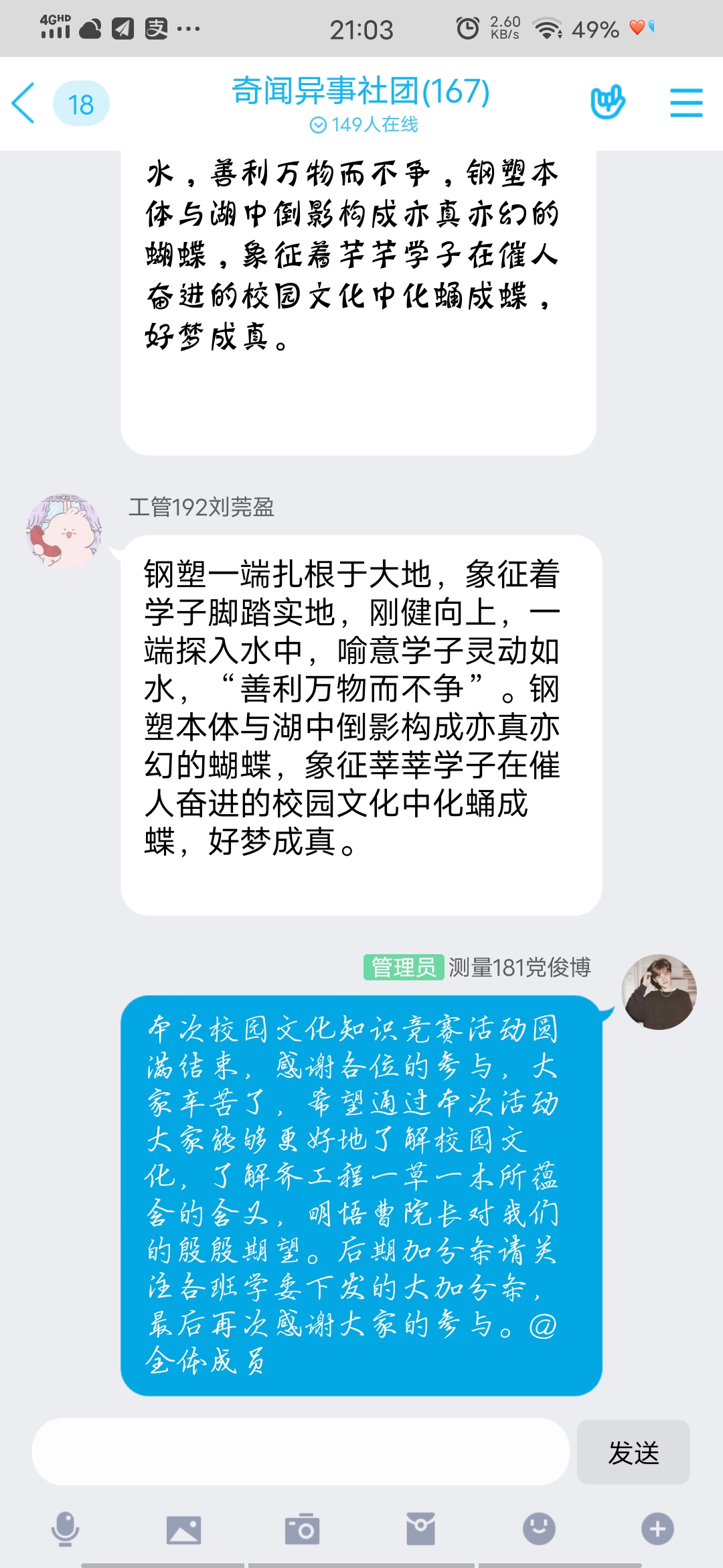 大学是以人才培养、科学研究、社会服务、文化传承与创新为主要功能的独特社会组织,校园文化是一所学校最核心的教学观念,也是一所学校最核心的精神所在。举办线上校园文化知识竞赛活动,使同学们深入学习了我院的建校之本立校之根,巩固了同学们对校园文化的记忆,同学们在进行集中比赛的过程中,既加深了对校园文化的理解,丰富了疫情期间学生课余生活,也增进了同学间的交流与互动。