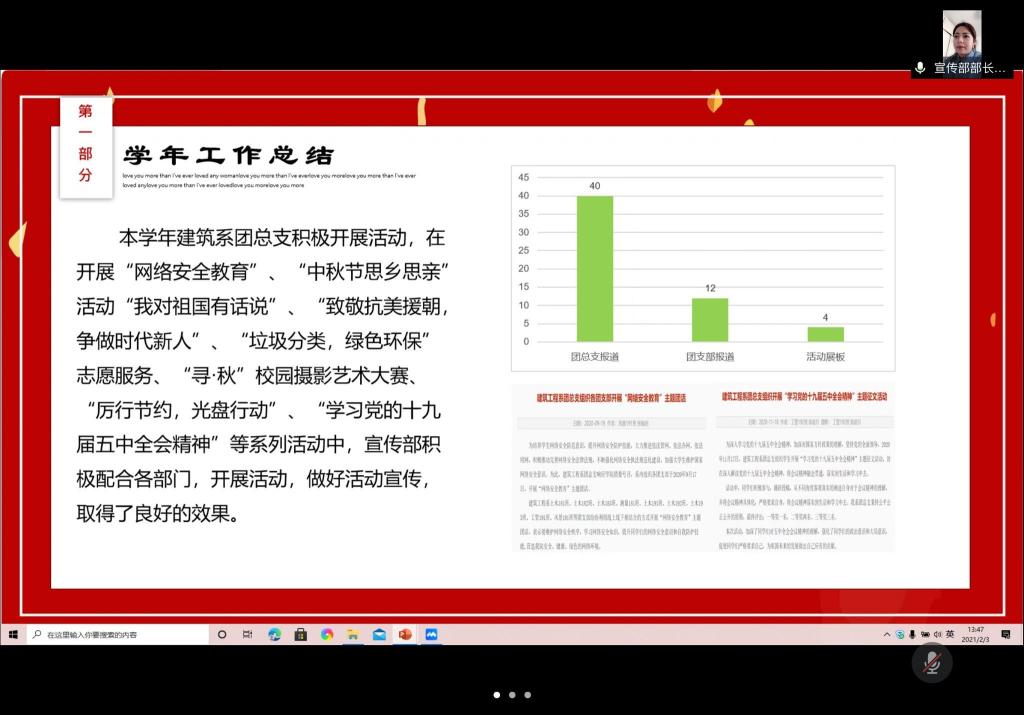 本次汇报总结了各学生干部的工作,凸显出大家工作中的闪光点和需要弥补的不足之处,督促每位学生干部自觉提高思想觉悟、推动内部协同合作。通过本次汇报也会为大家的未来工作有所帮助。希望在建校三十周年和建党一百周年之际,建筑工程系的学生干部能够砥砺前行,不负韶华!