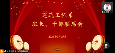为强化干部工作能力,推进开学准备工作,建筑工程系于2月25日通过腾讯会议召开了建筑工程系班长、学生干部及党员培训会,建筑工程系党总支书记、学生工作副主任王丽萍主持本次会议,学生会指导老师姬园梅、团总支书记宋雪微、全体党员、各班班长以及学生干部参加。