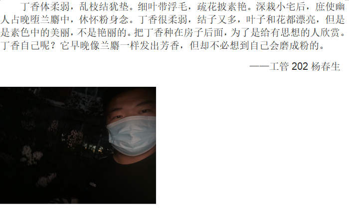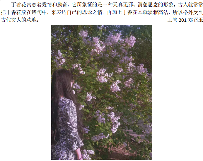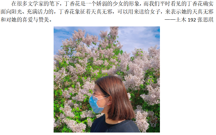 本次活动要求参赛人员在校园内拍摄自己与丁香花的合影,并附上作品简介。丁香花的花语是:纯真无邪,寓意勤奋、谦逊,象征学校的良好校风。学而社团希望同学们通过与丁香花的合影,不仅能够走进校园的每一个角落,感受丁香花带来的扑面香气,而且在与丁香花的合影中,能够体会到丁香花语所带来的美好寓意。