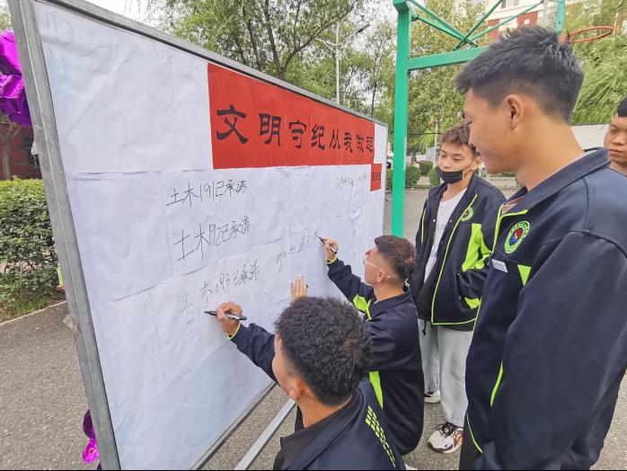 会议伊始,由学生代表王鹏发言,他表示将认真学习法律法规、校规校纪,提高自己的文明守纪意识,做好学生领袖作用。然后由班长代表杨耀杰、赵文凯、翟浩治发言,他们从考风考纪、寝室文明以及安全防范意识等方面做出承诺,并本着“文明守纪”的原则,做一名守规矩、懂文明的大学生。接下来由建筑工程系主任陈景鑫讲话,她希望大家以崭新的面貌、良好的心态迎接新学期,养成良好的学习、生活习惯,同时招聘季即将来临,希望高年级同学能及时了解就业动向,抓住机遇。会议最后,由全体班长及班级代表、学生干部进行签约仪式,大家纷纷在承诺板上签下了自己的名字。