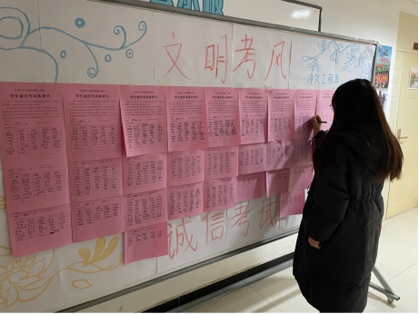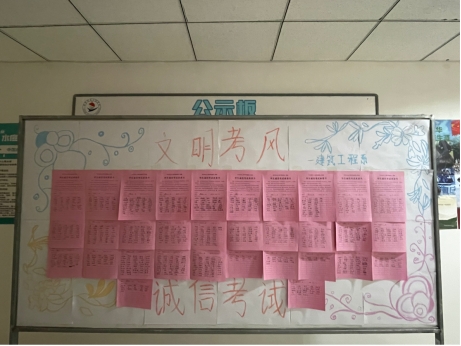 建筑工程系各辅导员在班级里开展考风考纪主题班会,让每个同学知道考风考纪的重要性,从根本上杜绝和防范作弊现象,全面改善学校考风考纪状况。为加大宣传力度,学生会在二教制作了考风考纪展板宣传活动,希望每一个同学都能把“诚信守纪为荣,作弊违规可耻”铭记在心,营造良好的考试氛围。