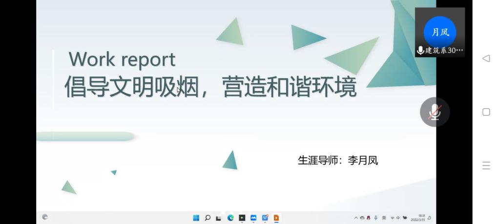 3月15日下午,生涯导师李月凤在腾讯会议召开“文明吸烟”主题教育班会,22名同学参加会议。会议上,李月凤老师从吸烟文明礼仪,营造和谐环境等方面展开说明。