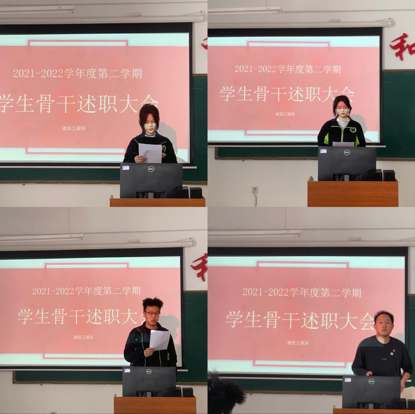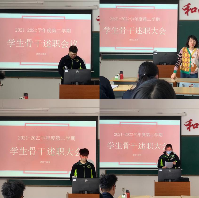 新学期伊始,建筑工程系学生会秉持为学生服务的宗旨,积极协校系开展各项活动,为进一步加强学生骨干的遴选和培养,提升学生骨干“三五”能力,建筑工程系于3月30日中午在二教1405召开学生会学生骨干述职大会。