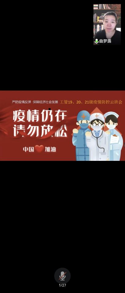 为认真贯彻落实省市疫情防控工作要求,全力做好校园疫情防控工作,2022年4月4日下午,建筑工程系工程管理专业辅导员蔡爽召开线上疫情防控云班会,工程管理专业长曲梦露、工程管理2019、2020、2021级全体学生参加。