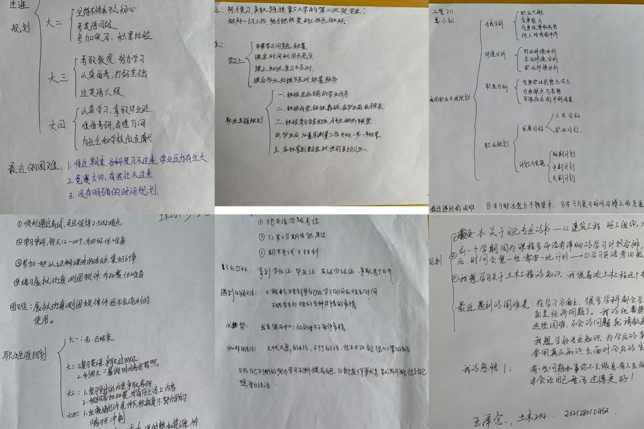 活动中同学们认真思考并写下自己近期的生涯规划与最近遇到的困难,学会了总结前期经验,在思考中明确我已学什么、我要学什么、我应该学什么,怎样发现机会、把握机会、创造机会。并且进一步明确自己的优势和真正想要什么样的生活、自己真正想要的是什么、做出怎样的决定能引导自己过上哪种生活。