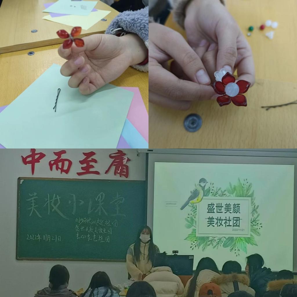 首先,活动开始由云扬羽裳汉文化社团副社长讲解本次饰品diy的活动的目的、意义及流程,并示范不同首饰的制作方法与技巧并分发材料包在他的示范下那些看似普普通通的首饰材料,经过几次整合,变成了一件精美的首饰,同学们看到这件精美首饰,热情高涨,纷纷自己动起手来,本次提供的制作饰品材料种类繁多,包括有多种颜色的彩珠及花瓣状饰品,同学们发挥自己的想象制作出一件又一件精美的首饰作品。接下来,素心花艺社社长分发彩色卡纸,原本普普通通的纸片在同学们的手中赋予了生命,有的变成了花芳香四溢,有的变成动物活灵活现。接下来是由美颜美妆社长组织大家观看了一些关于化妆的视频,为大家讲解如何化妆才能做到妆容自然,美丽。爱美之心人皆有之,美妆不仅仅是提升个人魅力、展现外在美的方式,也是提升女性自信心的有效方法。此次活动的开展,不仅提高了学生审美能力,更提高了学生的人文素养。