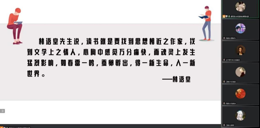 最是书香能致远,腹有诗书气自华。为推动“书香校园”文化建设,落实四学期专题读书活动,培养学生爱读书、读好书、有感想、有思想的素质能力,引领学生拓展敢思考、乐思考、想思考的知识汲取渠道,2023年2月16日,宋雪微老师组织开展“辅导员假期领读-专题读书”活动,本次活动于线上举行,由宋老师主持十位领读人分别以推荐书籍、名句共读、互动研讨等方式,成为本次领读活动的的“好书推荐官”,全系800名学生参加本次活动。